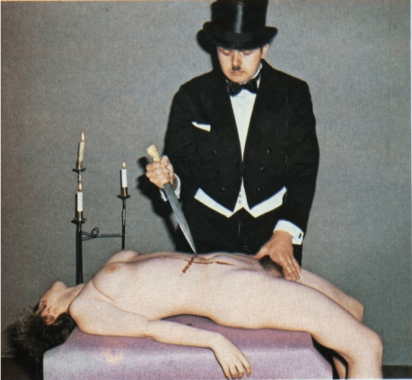 ”Rituaalin suorittajan asu on frakki tai punainen kaapu. Tässä tilanteessa kuuluu myös asiaan kasakkatikari. Tikarilla tehdään vatsaan risti. Tämä edesauttaa saatanallisen energian virtausta.” Jermu, 8/1976